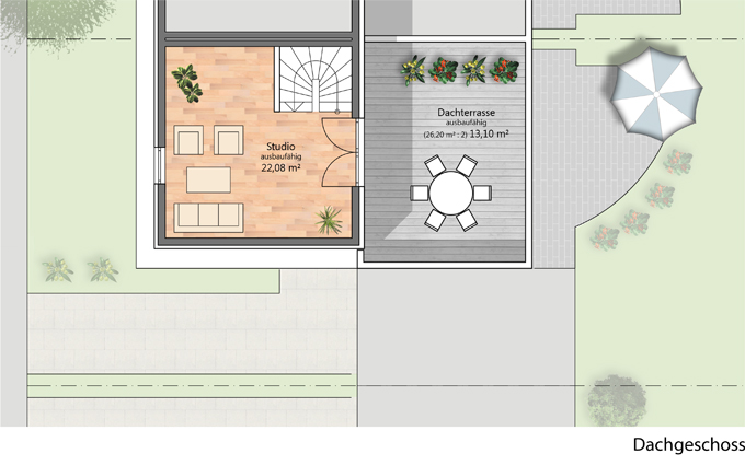 Der Garten und die Sonnenterrasse mit Blick auf den unverbaubaren Grünstreifen sind nach Westen ausgerichtet und sorgen somit für eine Sonnenlage, die zum Genießen und Entspannen einlädt. Diese Idylle ist perfekt gewachsen für die Privaterholung. Dazu genießen Sie Anliegerruhe der Sackgasse. Hier wurde nicht nur auf beste Ausstattung und gut durchdachte Grundrisse größten Wert gelegt, hier wurde vielmehr hoher Wohnkomfort mit schöner Architektur in Kombination mit grünem und doch städtischem Leben geboten.